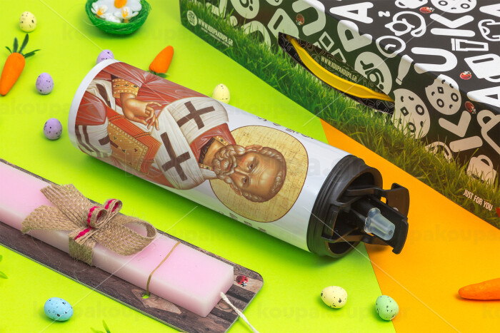 Saint Nicholas orthodox , Easter candle,Travel Tumbler 2 Lids, with metal straw & cleaning brush & aromatic flat candle (30cm) (PINK)