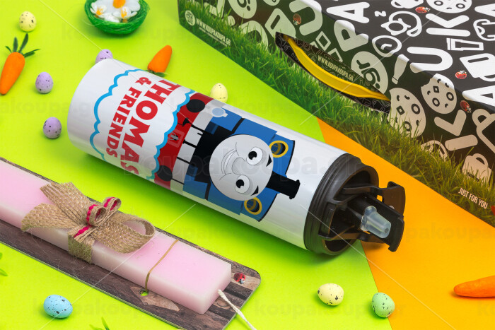 Τόμας το τρενάκι, Easter candle,Travel Tumbler 2 Lids, with metal straw & cleaning brush & aromatic flat candle (30cm) (PINK)
