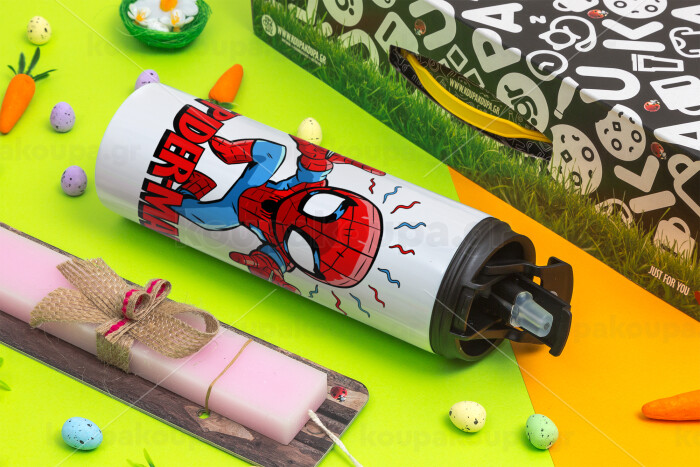 Spiderman flying, Easter candle,Travel Tumbler 2 Lids, with metal straw & cleaning brush & aromatic flat candle (30cm) (PINK)