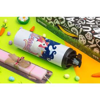 Μονόκερος, Easter candle,Travel Tumbler 2 Lids, with metal straw & cleaning brush & aromatic flat candle (30cm) (PINK)