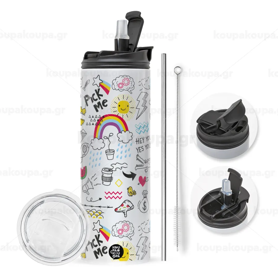 Eco friendly hot glass 600ml with metal reusable straw. Enjoy your favorite drink at any moment in this unique ecological thermos. It maintains the temperature for several hours and is made of stainless steel. Suitable for hot and cold drinks. Comes with a cleaning brush for the straw.