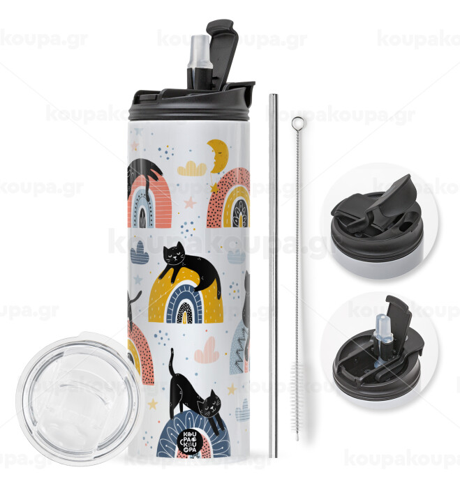 Eco friendly hot glass 600ml with metal reusable straw. Enjoy your favorite drink at any moment in this unique ecological thermos. It maintains the temperature for several hours and is made of stainless steel. Suitable for hot and cold drinks. Comes with a cleaning brush for the straw.