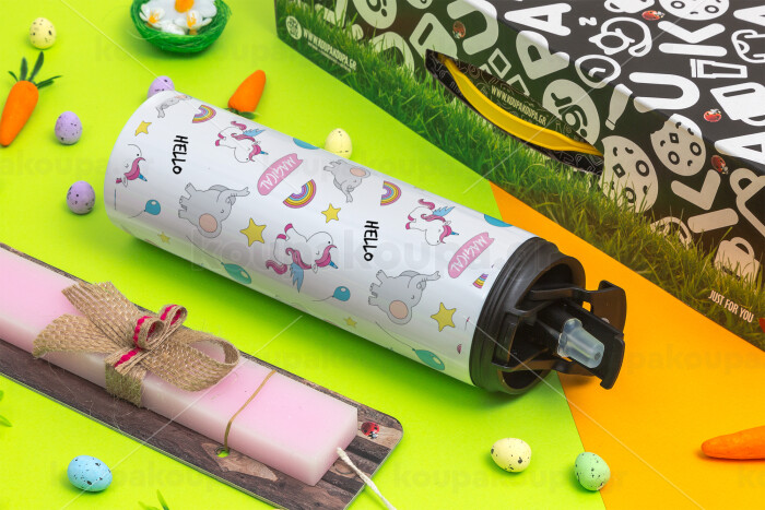 Happy Clouds Doodle, Easter candle,Travel Tumbler 2 Lids, with metal straw & cleaning brush & aromatic flat candle (30cm) (PINK)