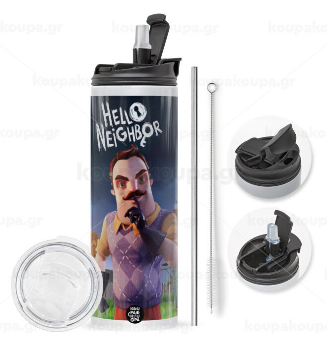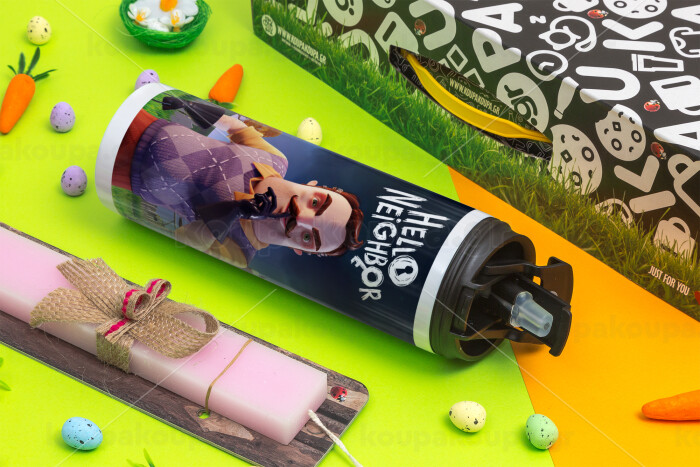 Hello Neighbor, Easter candle,Travel Tumbler 2 Lids, with metal straw & cleaning brush & aromatic flat candle (30cm) (PINK)