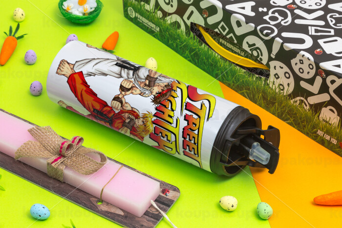 Street fighter, Easter candle,Travel Tumbler 2 Lids, with metal straw & cleaning brush & aromatic flat candle (30cm) (PINK)