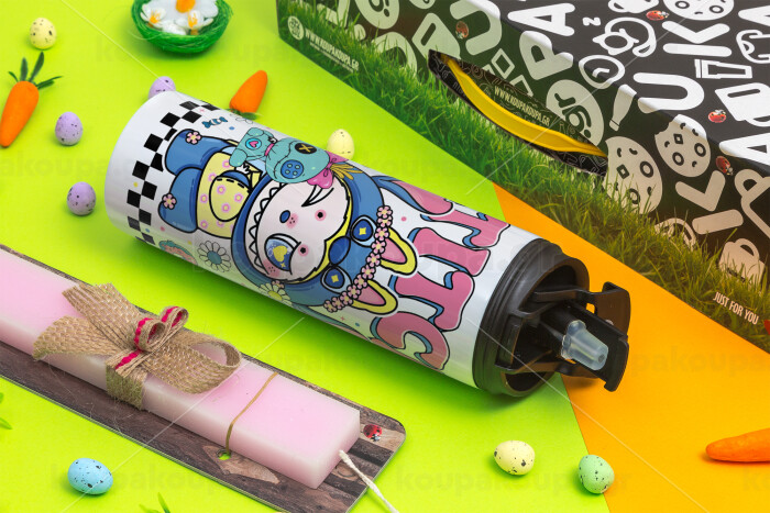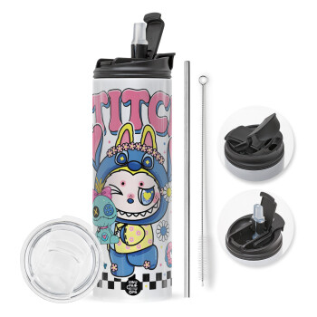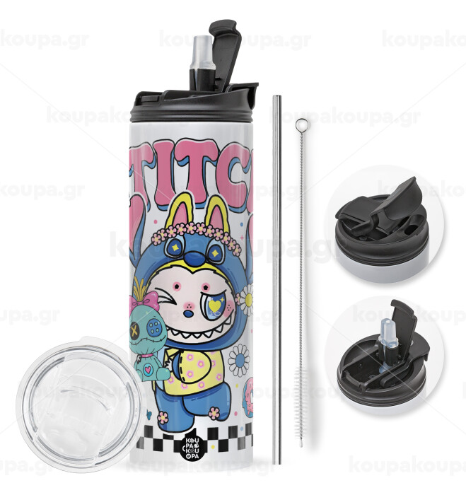 Labubu Stitch, Easter candle,Travel Tumbler 2 Lids, with metal straw & cleaning brush & aromatic flat candle (30cm) (PINK)