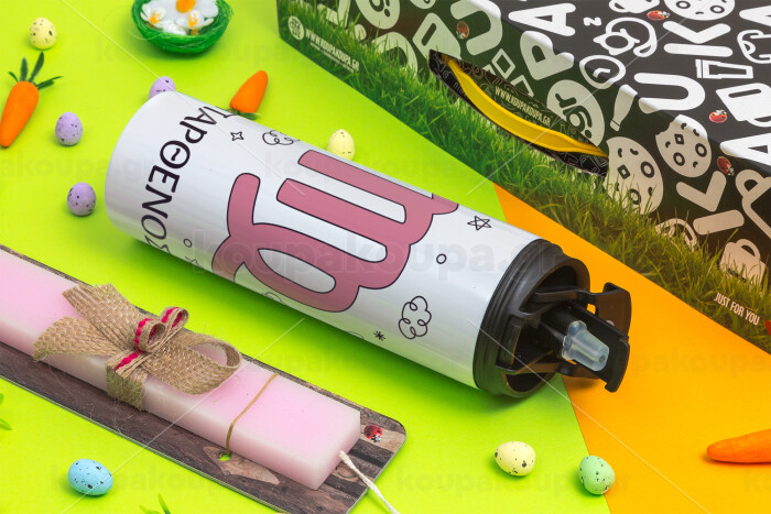 Ζώδια Παρθένος, Easter candle,Travel Tumbler 2 Lids, with metal straw & cleaning brush & aromatic flat candle (30cm) (PINK)