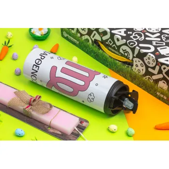 Ζώδια Παρθένος, Easter candle,Travel Tumbler 2 Lids, with metal straw & cleaning brush & aromatic flat candle (30cm) (PINK)
