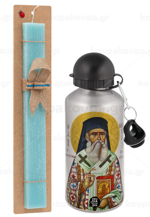 Saint Nektarios, Easter Set, metallic silver aluminum water bottle (500ml) & scented flat Easter candle (30cm) (TURQUOISE)