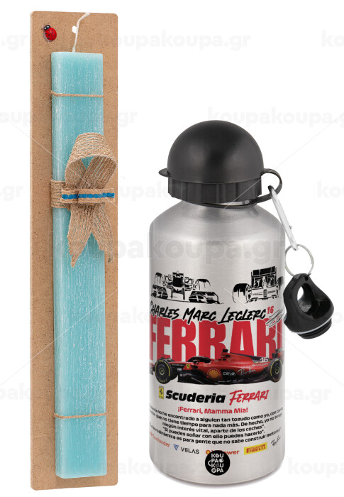 F1 Ferrari, Easter Set, metallic silver aluminum water bottle (500ml) & scented flat Easter candle (30cm) (TURQUOISE)
