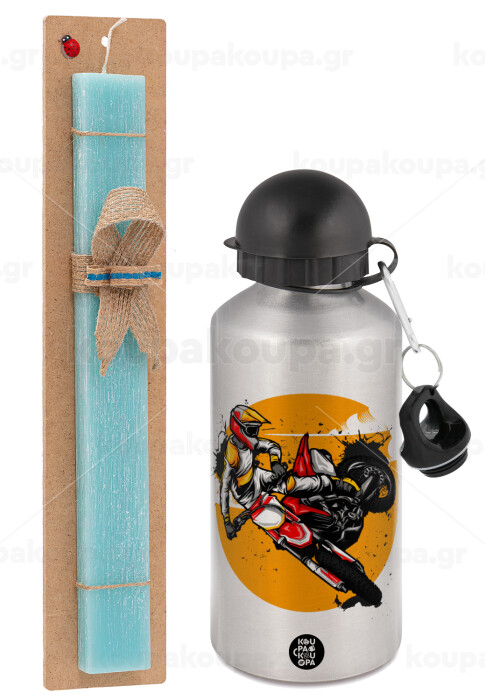 Motocross, Easter Set, metallic silver aluminum water bottle (500ml) & scented flat Easter candle (30cm) (TURQUOISE)