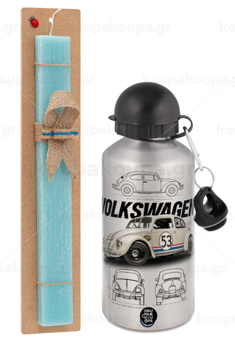 Volkswagen Beetle, Easter Set, metallic silver aluminum water bottle (500ml) & scented flat Easter candle (30cm) (TURQUOISE)