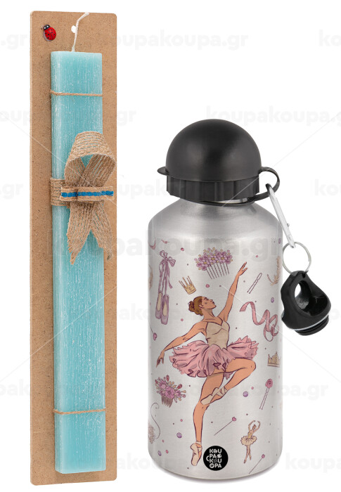 Ballet Dancer, Easter Set, metallic silver aluminum water bottle (500ml) & scented flat Easter candle (30cm) (TURQUOISE)