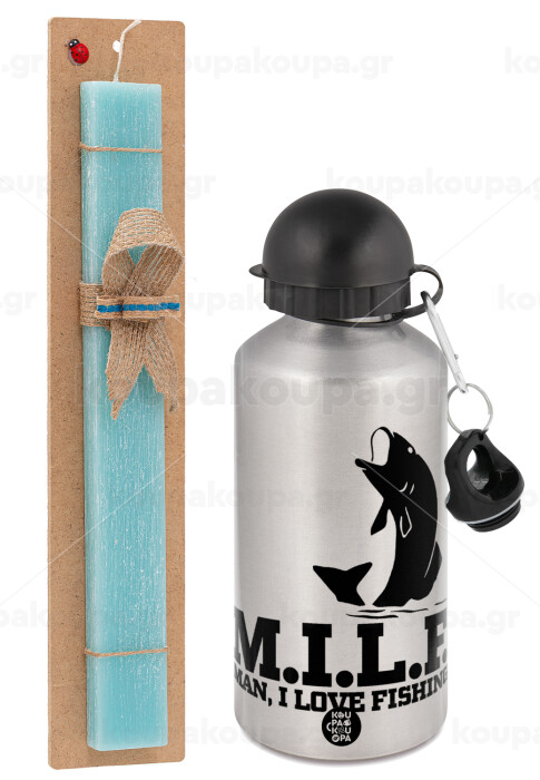 M.I.L.F. Mam i love fishing, Easter Set, metallic silver aluminum water bottle (500ml) & scented flat Easter candle (30cm) (TURQUOISE)