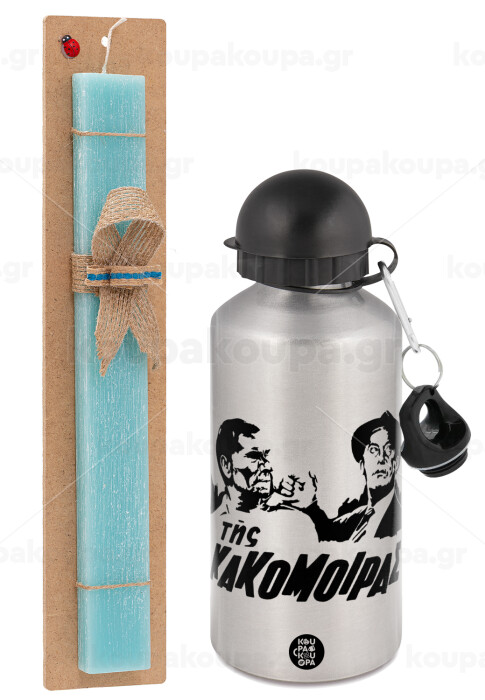 Tis kakomoiras, Easter Set, metallic silver aluminum water bottle (500ml) & scented flat Easter candle (30cm) (TURQUOISE)