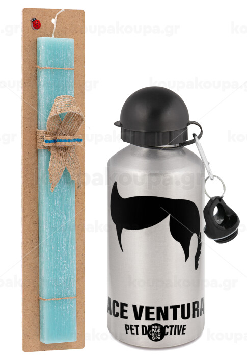 Ace Ventura Pet Detective, Easter Set, metallic silver aluminum water bottle (500ml) & scented flat Easter candle (30cm) (TURQUOISE)