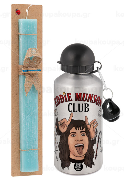 Eddie Munson, Hellfire CLub, Stranger Things, Easter Set, metallic silver aluminum water bottle (500ml) & scented flat Easter candle (30cm) (TURQUOISE)