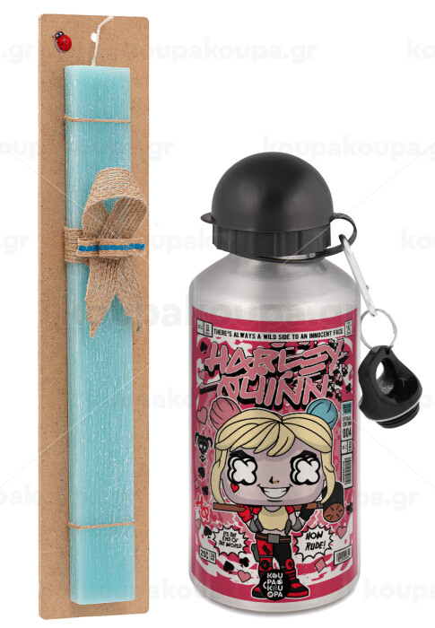 Harley Quinn (Χάρλεϊ Κουίν), Easter Set, metallic silver aluminum water bottle (500ml) & scented flat Easter candle (30cm) (TURQUOISE)