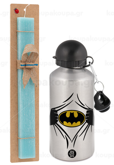 Hero batman, Easter Set, metallic silver aluminum water bottle (500ml) & scented flat Easter candle (30cm) (TURQUOISE)