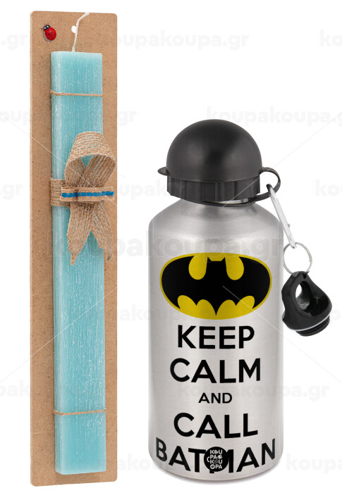 KEEP CALM & Call BATMAN, Easter Set, metallic silver aluminum water bottle (500ml) & scented flat Easter candle (30cm) (TURQUOISE)