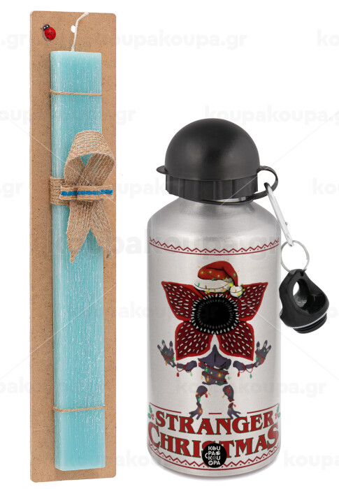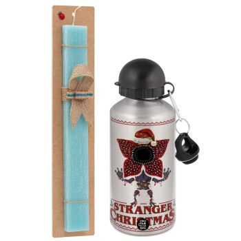 Stranger Things Christmas, Easter Set, metallic silver aluminum water bottle (500ml) & scented flat Easter candle (30cm) (TURQUOISE)