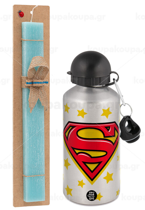 Superman Blue, Easter Set, metallic silver aluminum water bottle (500ml) & scented flat Easter candle (30cm) (TURQUOISE)
