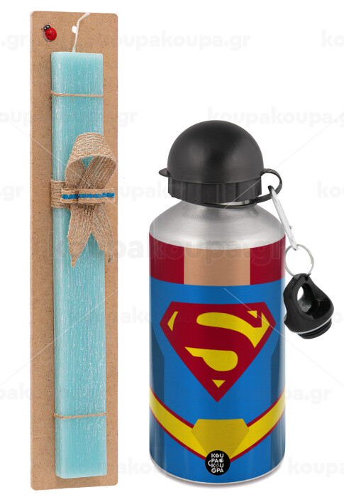 Superman flat, Easter Set, metallic silver aluminum water bottle (500ml) & scented flat Easter candle (30cm) (TURQUOISE)