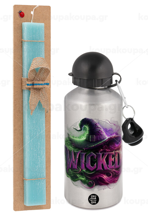 Wicked, Easter Set, metallic silver aluminum water bottle (500ml) & scented flat Easter candle (30cm) (TURQUOISE)