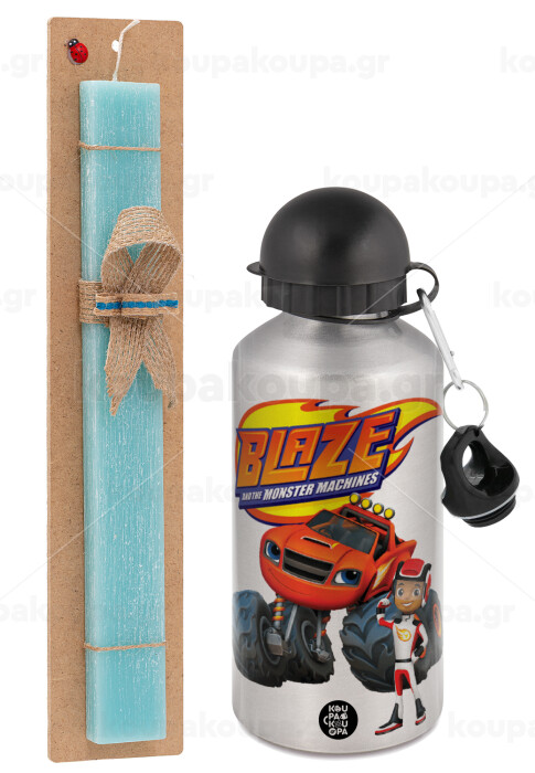 Ο Μπλέιζ και οι Φίλοι του, Easter Set, metallic silver aluminum water bottle (500ml) & scented flat Easter candle (30cm) (TURQUOISE)