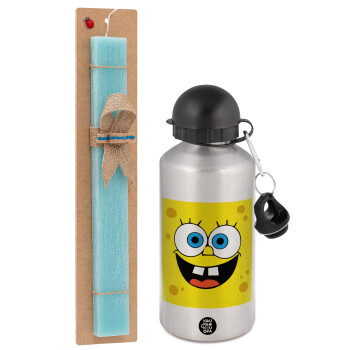 BOB, Easter Set, metallic silver aluminum water bottle (500ml) & scented flat Easter candle (30cm) (TURQUOISE)
