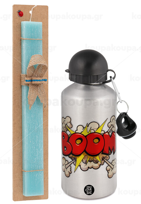 BOOM!!!, Easter Set, metallic silver aluminum water bottle (500ml) & scented flat Easter candle (30cm) (TURQUOISE)