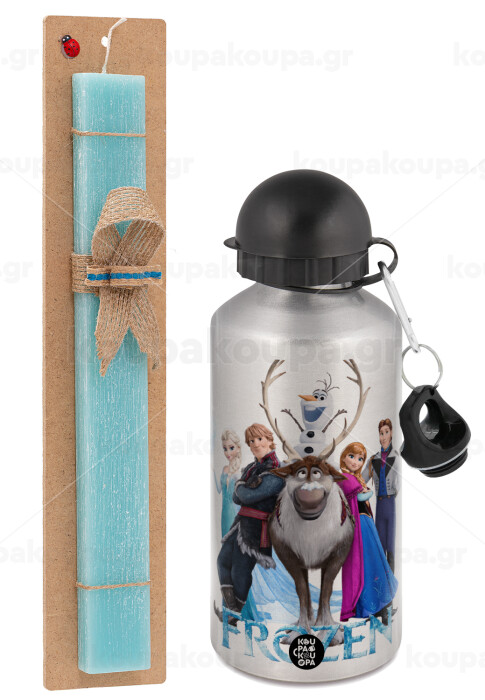 Frozen, Easter Set, metallic silver aluminum water bottle (500ml) & scented flat Easter candle (30cm) (TURQUOISE)