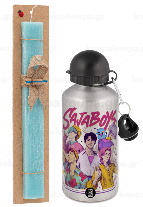 Huntrix Saja Boys, Easter Set, metallic silver aluminum water bottle (500ml) & scented flat Easter candle (30cm) (TURQUOISE)