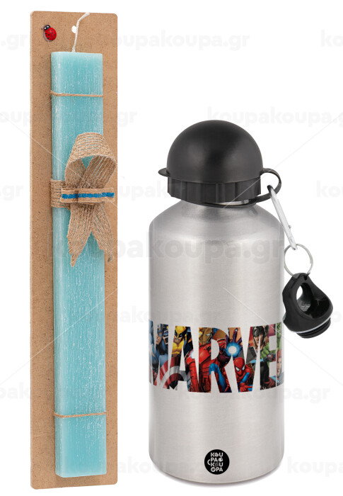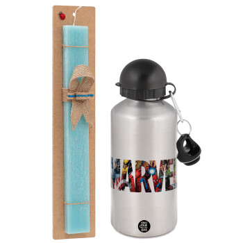 MARVEL characters, Easter Set, metallic silver aluminum water bottle (500ml) & scented flat Easter candle (30cm) (TURQUOISE)