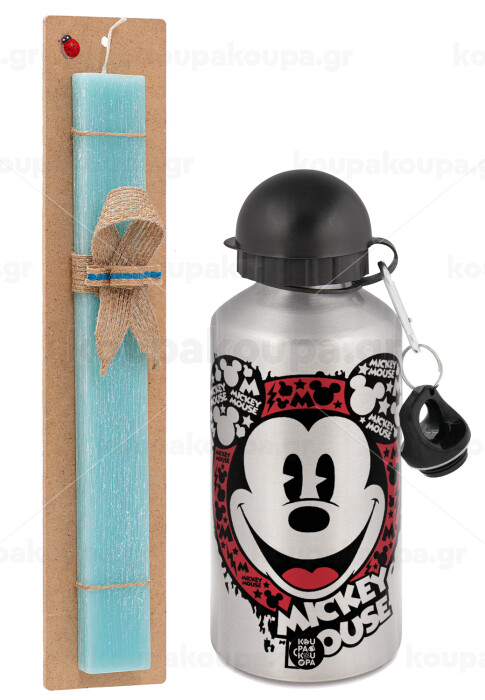 Mickey Mouse, Easter Set, metallic silver aluminum water bottle (500ml) & scented flat Easter candle (30cm) (TURQUOISE)
