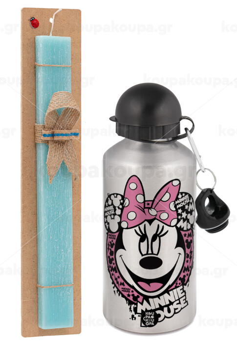 Minnie mouse, Easter Set, metallic silver aluminum water bottle (500ml) & scented flat Easter candle (30cm) (TURQUOISE)