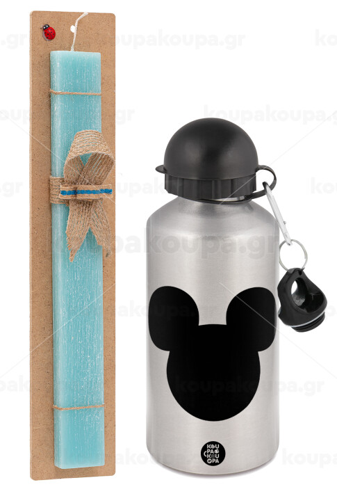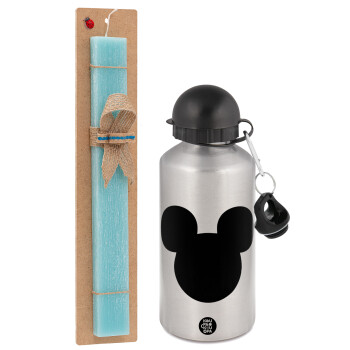 mouse man, Easter Set, metallic silver aluminum water bottle (500ml) & scented flat Easter candle (30cm) (TURQUOISE)