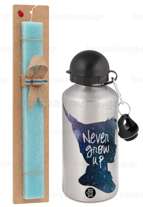 Never Grow UP, Easter Set, metallic silver aluminum water bottle (500ml) & scented flat Easter candle (30cm) (TURQUOISE)