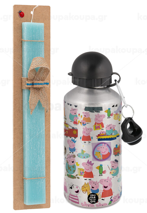Peppa pig Characters, Easter Set, metallic silver aluminum water bottle (500ml) & scented flat Easter candle (30cm) (TURQUOISE)