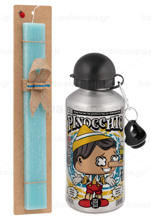 Pinocchio, Easter Set, metallic silver aluminum water bottle (500ml) & scented flat Easter candle (30cm) (TURQUOISE)