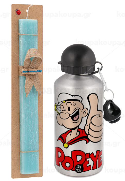 Popeye the sailor man, Easter Set, metallic silver aluminum water bottle (500ml) & scented flat Easter candle (30cm) (TURQUOISE)