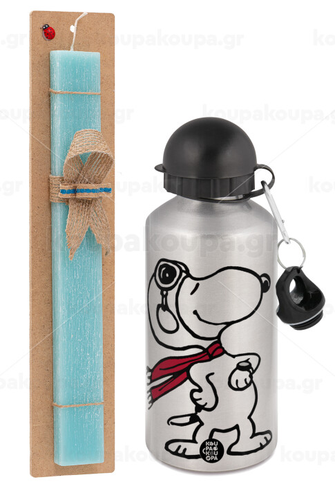 Snoopy ο πιλότος, Easter Set, metallic silver aluminum water bottle (500ml) & scented flat Easter candle (30cm) (TURQUOISE)