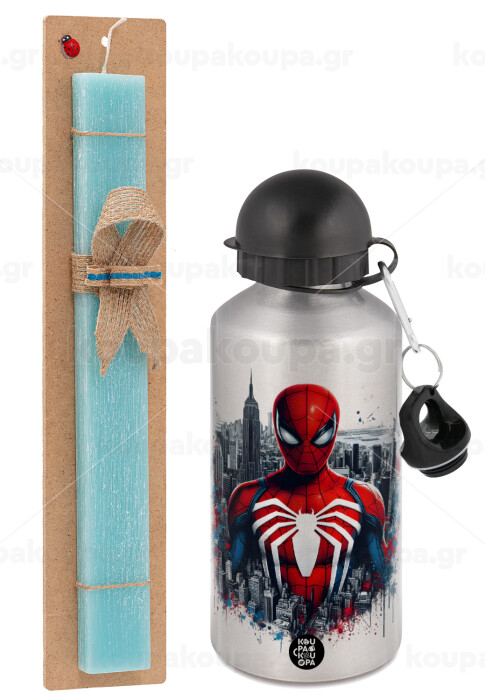 Spiderman City, Easter Set, metallic silver aluminum water bottle (500ml) & scented flat Easter candle (30cm) (TURQUOISE)