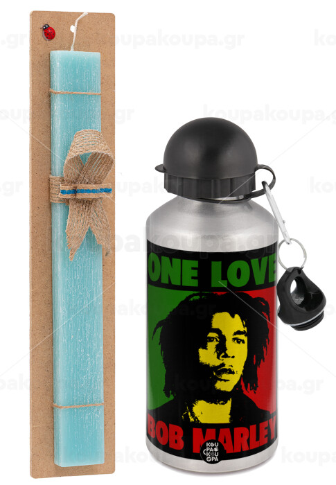 Bob marley, one love, Easter Set, metallic silver aluminum water bottle (500ml) & scented flat Easter candle (30cm) (TURQUOISE)