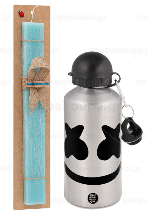 Marshmello, Easter Set, metallic silver aluminum water bottle (500ml) & scented flat Easter candle (30cm) (TURQUOISE)