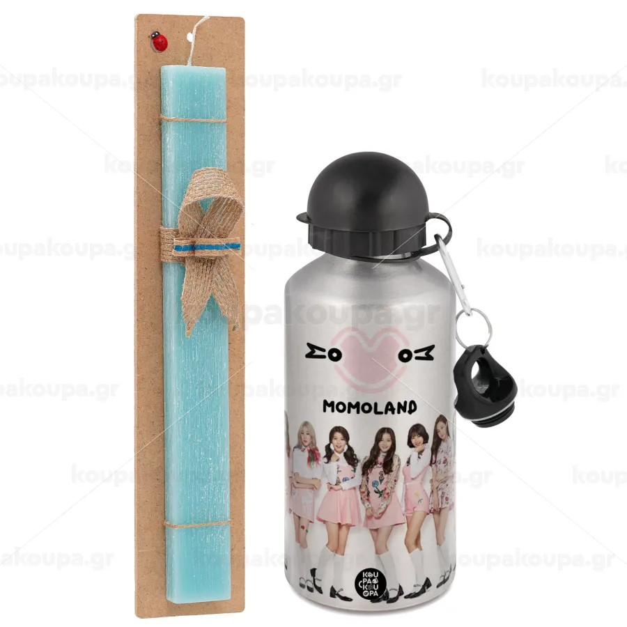 Momoland pink, Easter Set, metallic silver aluminum water bottle (500ml) & scented flat Easter candle (30cm) (TURQUOISE)