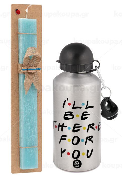Friends i i'll be there for you, Easter Set, metallic silver aluminum water bottle (500ml) & scented flat Easter candle (30cm) (TURQUOISE)