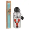 Friends you're my lobster, Easter Set, metallic silver aluminum water bottle (500ml) & scented flat Easter candle (30cm) (TURQUOISE)