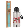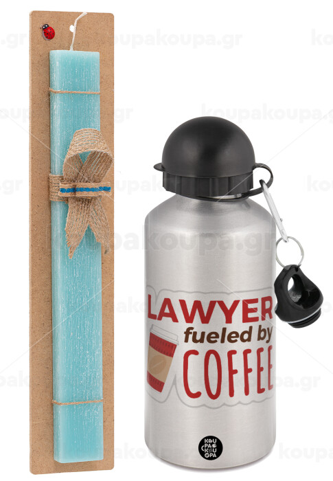 Lawyer fueled by coffee, Easter Set, metallic silver aluminum water bottle (500ml) & scented flat Easter candle (30cm) (TURQUOISE)