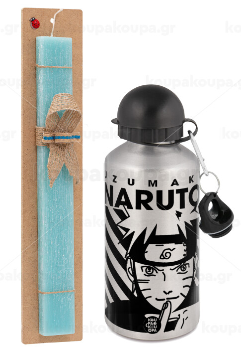 Naruto uzumaki, Easter Set, metallic silver aluminum water bottle (500ml) & scented flat Easter candle (30cm) (TURQUOISE)